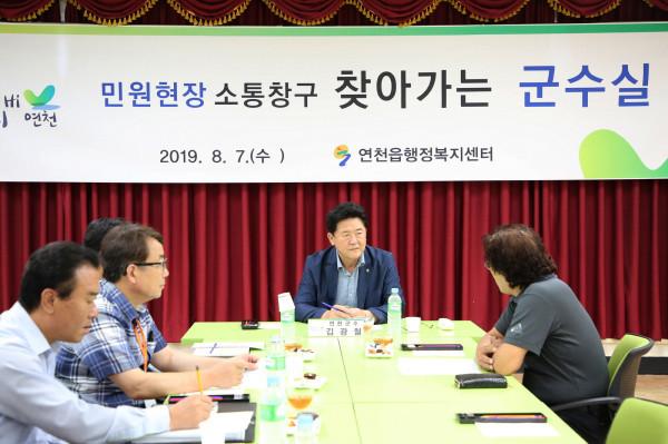 김광철 경기 연천군수는 최근 연천읍행정복지센터 회의실에서 8월 ‘찾아가는 군수실’을 운영했다. 이날 와초리 지역 태양광 설치에 대한 주민반대 등에 대한 해결방안을 논의했다. 사진은 김 군수가 주민들의 의견을 청취하는 모습. (사진제공=연천군청)