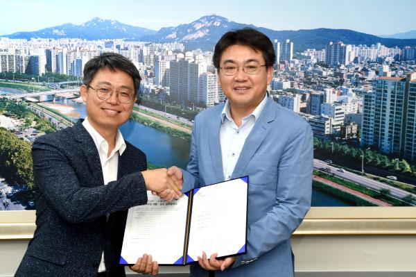 서울 노원구는 최근 서라벌고등학교와 함께 학교주차장 개방 협약을 체결했다. 협약에 따라 서라벌고등학교는 오는 2021년 8월7일까지 주차장 20면을 개방하게 된다. 사진은 오승록 구청장(오른쪽)과 김상덕 교장이 기념촬영을 하는 모습. (사진제공=노원구청)